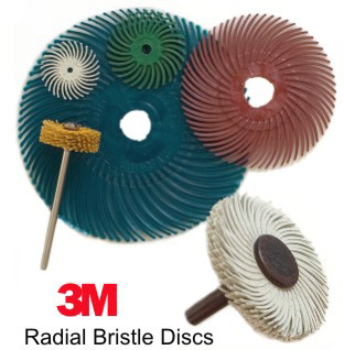 3M Scotch-Brite™ Radial Bristle DiscsThese 3M radial bristle discs are designed for wood or metal applications and will allow you to sand in places that have been unreachable up to now. Excellent for de-burring, de-fuzzing and sanding of irregular surfaces. For most applications, 3M recommends an operating speed of 15,000 rpm for best results. In our experiecne, 4 to 5,000 rpm is suitable for some tasks. Available in 6 or 12 packs in various grits and sizes. REQUIRED MOUNTING MANDRELS are listed within each size category.