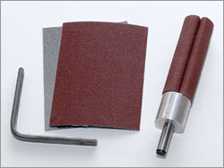Sleeveless Cushioned Sanding DrumsOur sanding drums are an exceptional value. There are no sleeves to buy. Using the supplied template, simply cut to size any abrasive sheet you want to use and install it using the locking cam. There is a cushioned surface under the abrasive, making them ideal for sanding contours. Each has a steel shank, and is most commonly used in flexible shaft machines such as the FOREDOM models, or in a drill if desired. These are ideal for sanding inside flared openings, in tight radius necks, carved areas, etc. |